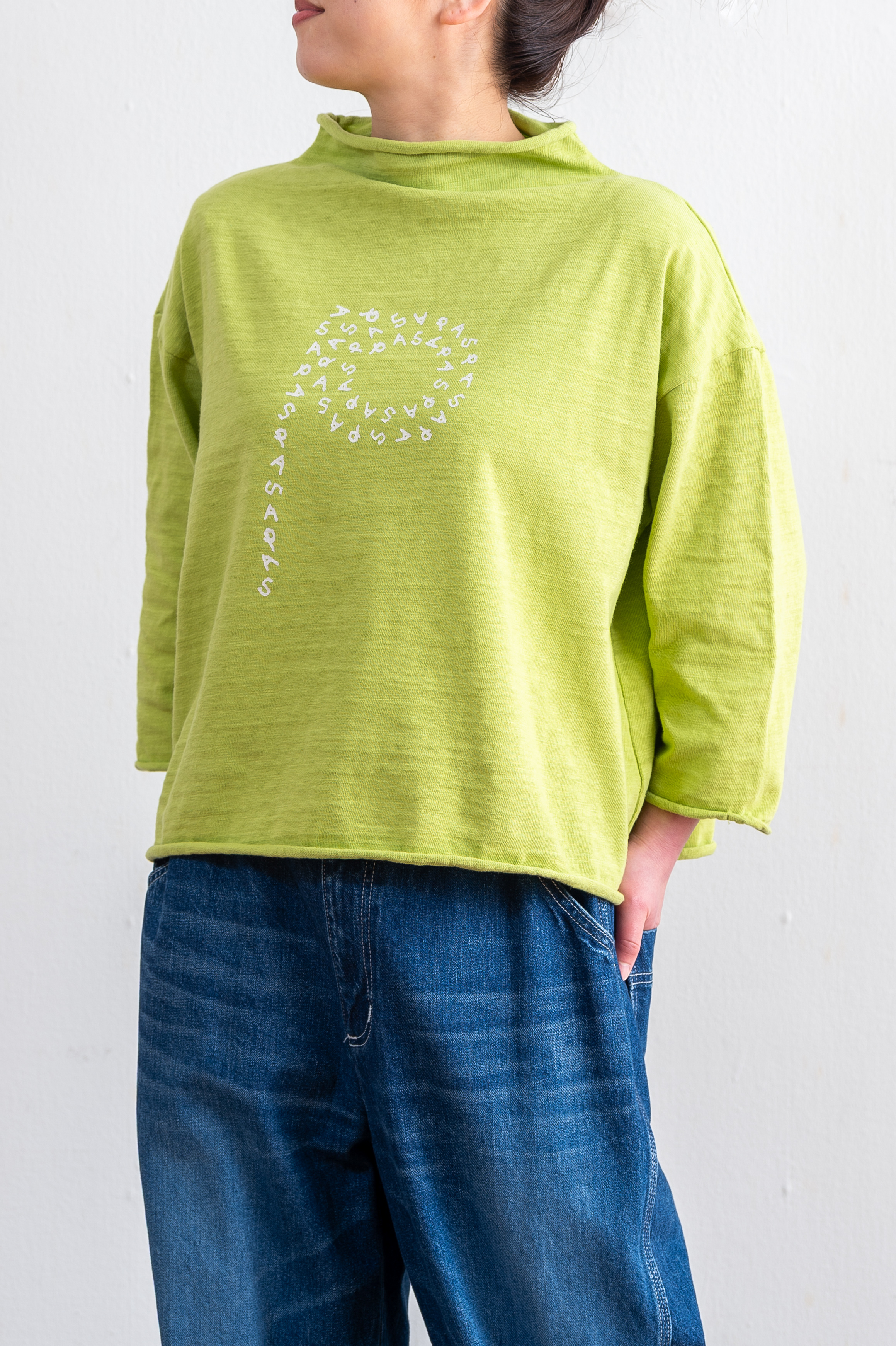 ムラ糸を使用したオリジナル天竺/ぐるぐるPプリント〈ボトルネックショート丈プルオーバー〉