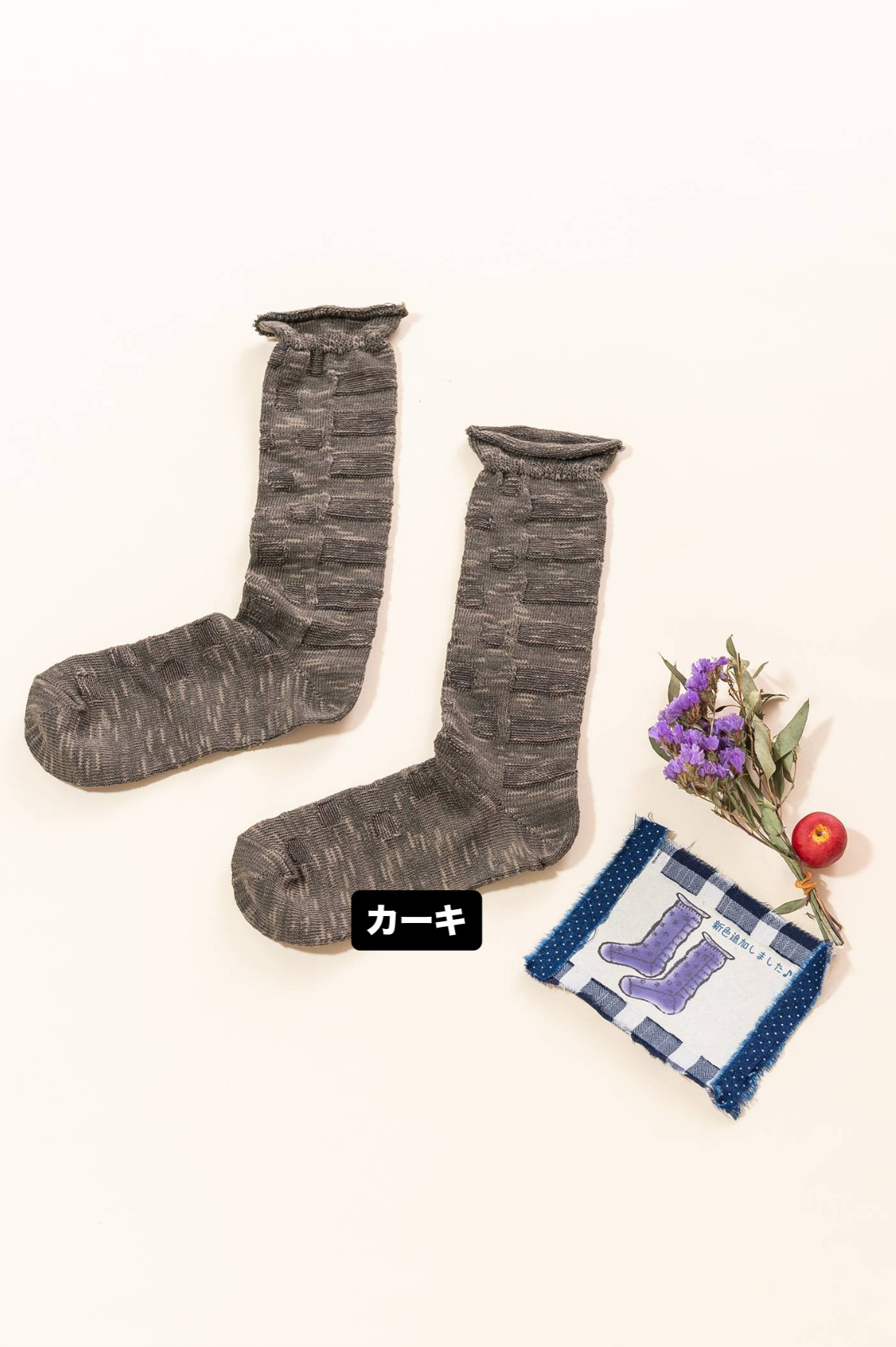 綿スラブでムラ感のあるボーダーとドット模様の靴下。少し長めの丈なのでクシュッとさせたりロールアップしたパンツから覗かせたトレンドらしい合わせ方もおすすめです。